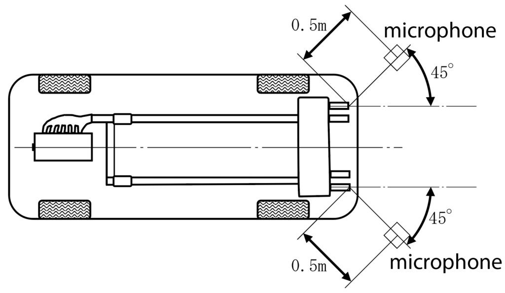The measurement RPM for exhaust noise is taken at 3,750 rpm, which is the RPM indicated in the remarks column of the vehicle inspection certificate. The measurement point is as described in R51-03. As shown in the figure above, the microphone should be placed at a position 0.5 m away from and at a 45-degree angle to the furthest outside exhaust tip from the longitudinal centerline of the vehicle.